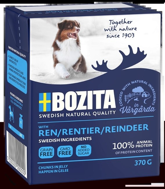 Składniki karm Bozita pochodzą z naturalnych szwedzkich gospodarstw, które kierują się szacunkiem do człowieka, zwierząt i środowiska. Właśnie z tego powodu w składzie nie ma żadnych zbędnych dodatków - wszystko jest w 100% naturalne, a jakość składników podlega regularnym kontrolom. Karma podstawowa dla dorosłych psów. Ponadto w Szwecji obowiązują surowe prawa dotyczące ochrony zwierząt i BHP. Wszystkie te czynniki są gwarancją, że Twój pies otrzyma wysokowartościowe, pewne i smaczne posiłki bez antybiotyków ani mączek. Karma o smaku renifera w galarecie.