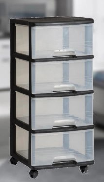 Regał organizer z 4 szufladami w kolorze czarnym o pojemności 20l każda.