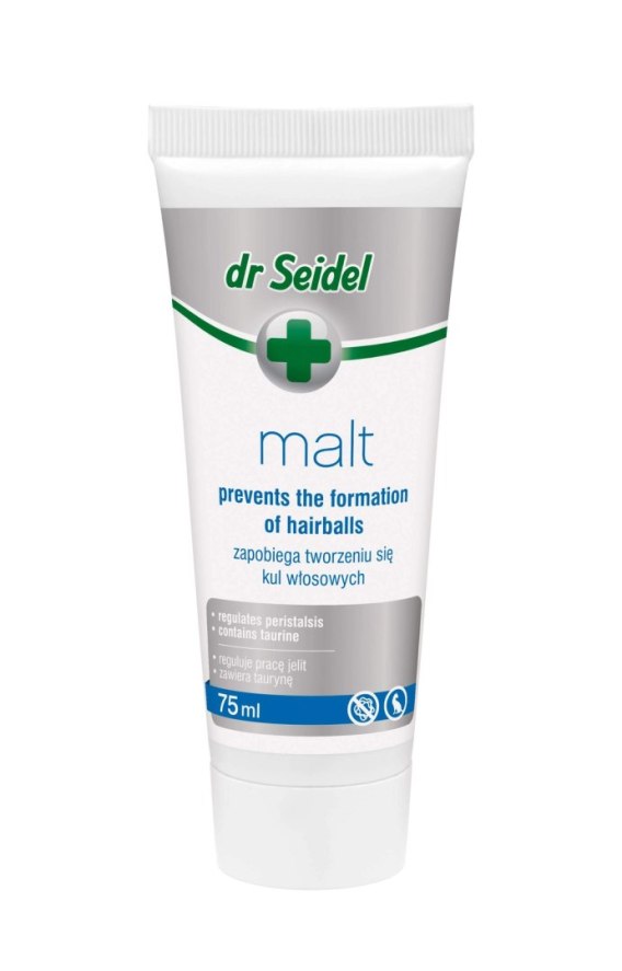 Dr Seidel Malt Pasta dla kota likwidująca zatory przewodu pokarmowego, preparat ułatwiający transport włosów przez przewód pokarmowy kota. Zapobiega tworzeniu się kul włosowych, których efektem są wymioty lub zaparcia. Reguluje pracę jelit.
