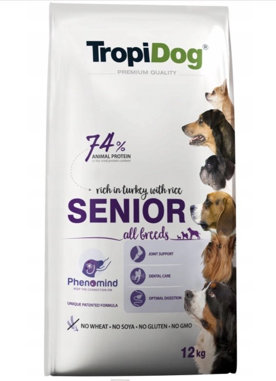 TropiDog Senior All Breeds - Bogata w indyka z ryżem ma obniżoną w stosunku do karmy dla psów dorosłych zawartość białka, dopasowaną do potrzeb starzejących się psów. Produkt nie jest przeznaczony do karmienia szczeniąt oraz suk w okresie ciąży i laktacji.